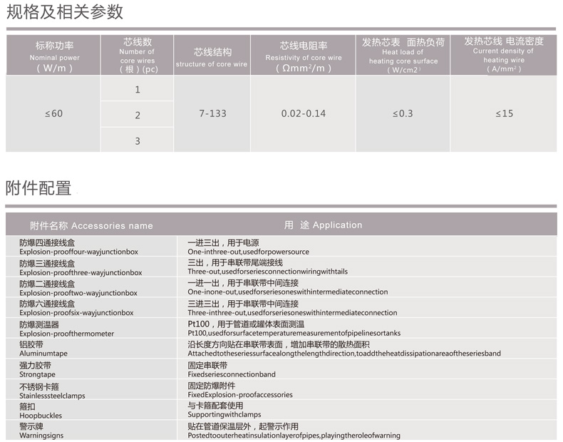 簡介: 高值PTC串聯(lián)式電熱帶是一種利用導(dǎo)電芯線為發(fā)熱元件的伴熱電纜,用于石油、化工等行業(yè)長輸管道防凍、防凝、保溫和熱補償,串聯(lián)式電熱帶的單根設(shè)計長度可在100~5000米內(nèi)任意選擇。技術(shù)參數(shù): ◆ 額定電壓:≤660V 50Hz/60Hz; ◆ 長度范圍:100~5000米/根; ◆ 功率范圍:≤60W/m; ◆ 介電強度:工作電壓220V為1500V/min,工作電壓為380V為1800V/min,工作電壓為660V為2500V/min; ◆ 防爆等級:ExeⅡT4; ◆ 耐溫等級:125℃、180℃、205℃、260℃; ◆ 導(dǎo)電芯線材質(zhì):PTC合金、鎳基合金、康銅、鍍銀銅絞線、鍍鎳銅絞線、鍍錫銅絞線; ◆ 芯線數(shù):單芯、雙芯或三芯; ◆ 發(fā)熱芯線電阻率范圍:0.02~0.14Ω.mm/m范圍內(nèi)任意選擇; ◆ 絕緣材料:F46、PFA、阻燃硅橡膠。特點: ◆ 針對某一管道工作參數(shù)專門設(shè)計,可靠性高; ◆ 結(jié)構(gòu)科學(xué)合理,使用壽命較其它電伴熱帶長; ◆ 適合于管線長度較長且電源點少的伴熱管道; ◆ 適用于環(huán)境惡劣的有腐蝕性的場所。典型應(yīng)用: 各種固定管線、管網(wǎng)的伴熱、石油石化、化工、電力、化纖、港口碼頭、油田等長輸管線或大型罐體的伴熱。產(chǎn)品外形與結(jié)構(gòu)